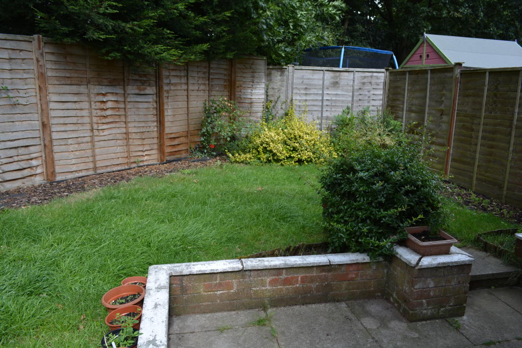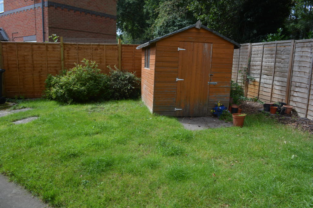 Generous size rear garden with patio area and store shed.