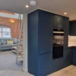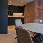 The sleek, fully integrated kitchen is fitted with high-spec appliances and elegant cabinetry, perfectly complementing the apartment’s modern aesthetic.