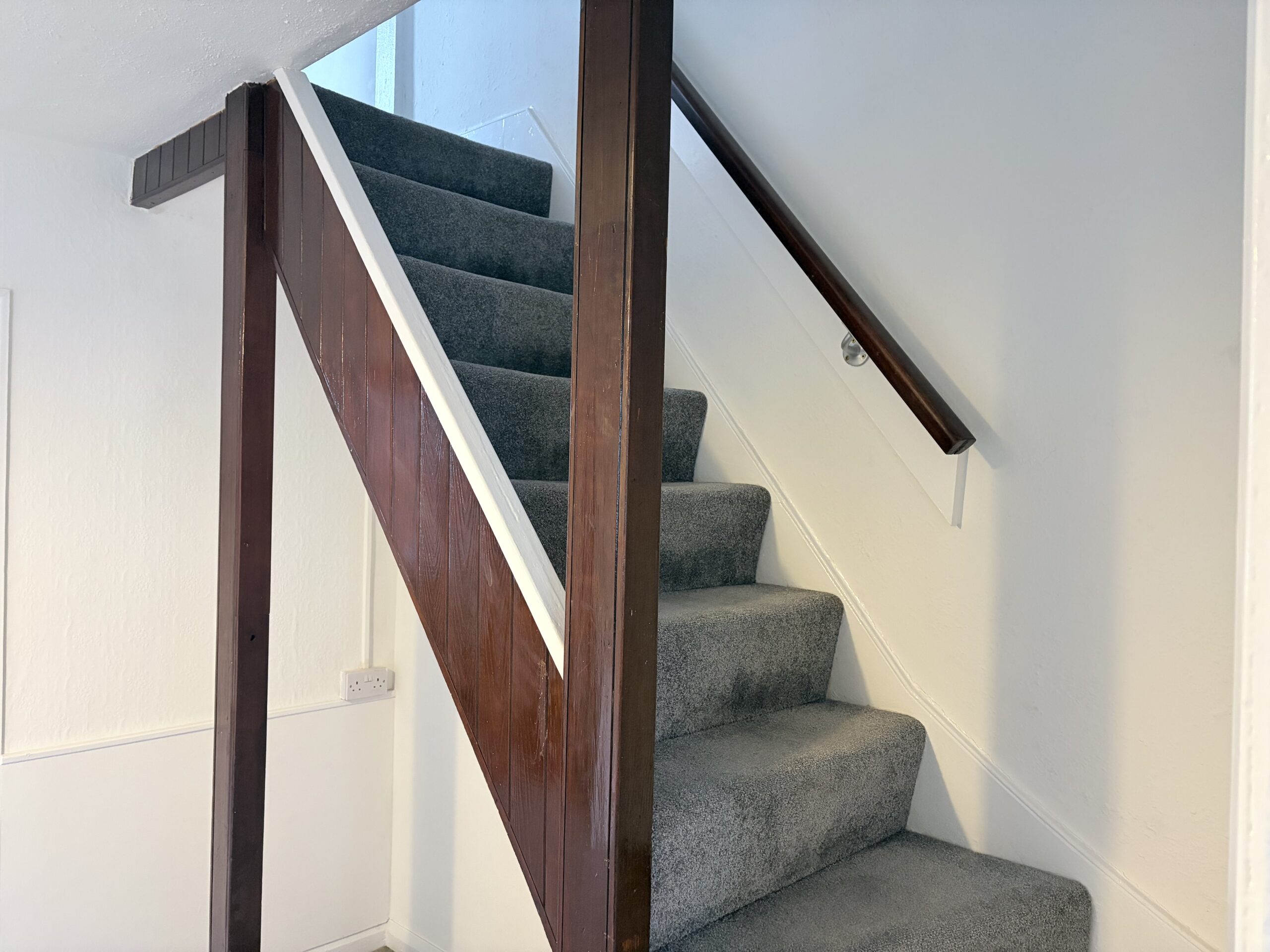 Staircase leads from the central dining area to master bedroom being a double room to the front of the house with wardrobes and the single second bedroom to the rear.