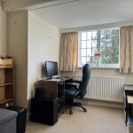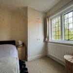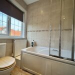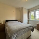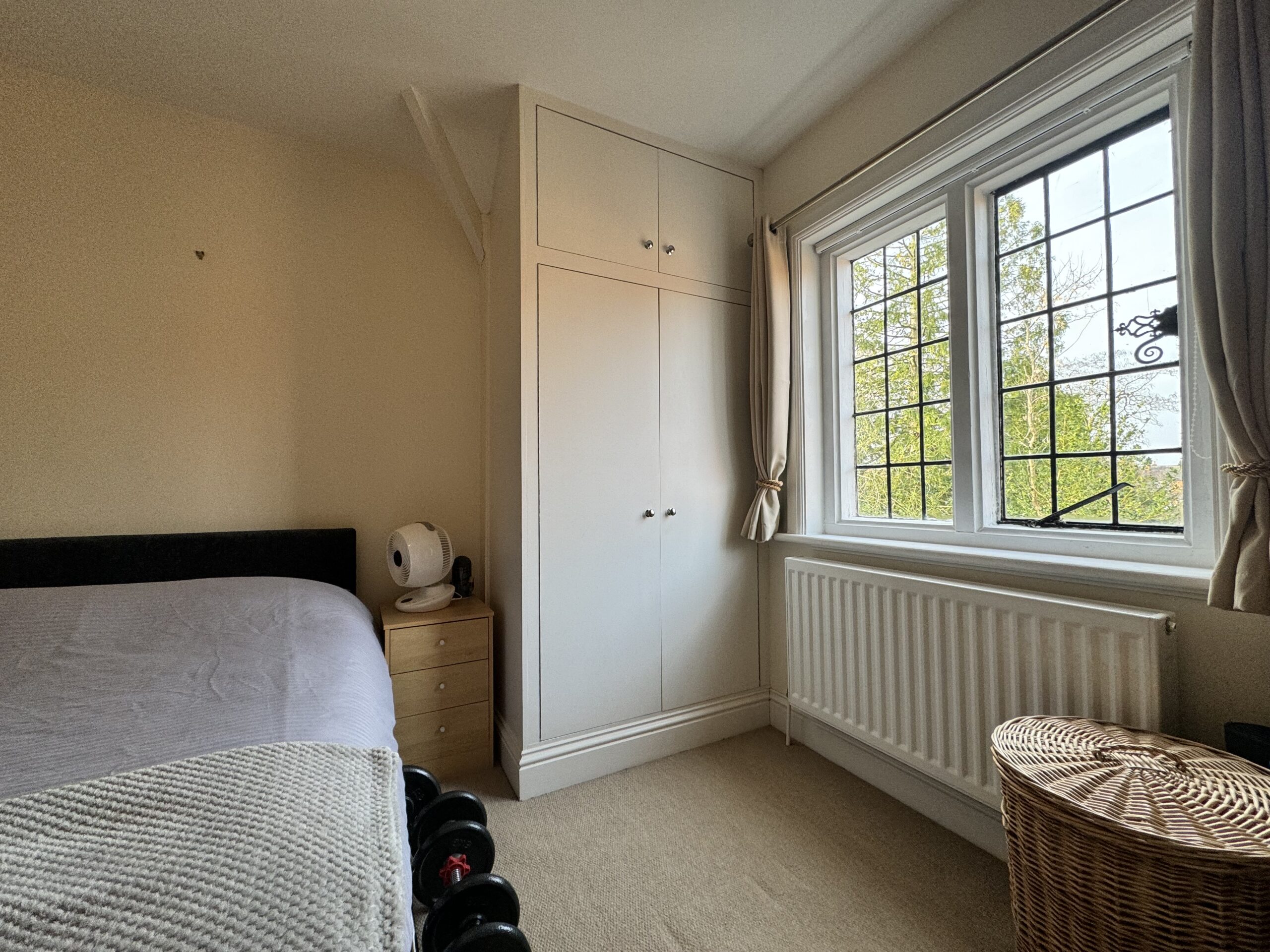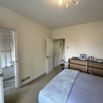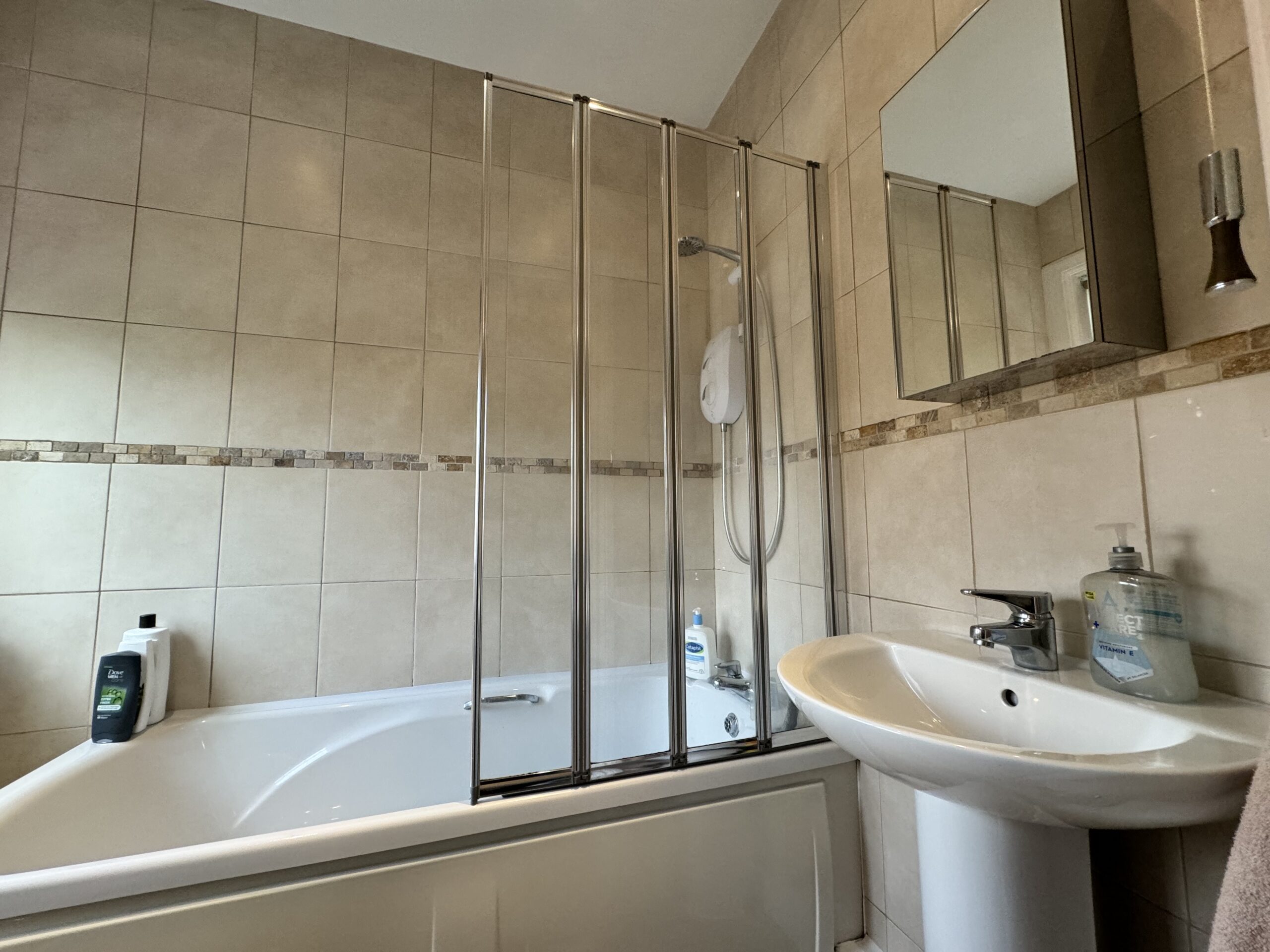 The bedroom is a double room with wardrobe cupboard leading to a modern bathroom suite with shower over bath.
